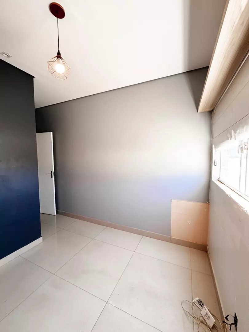 Primeiro Andar (200m²): Acesso por escada, com área para quatro salas, copa/cozinha e dois banheiros. Garagem coberta para dois carros e entrada adicional.